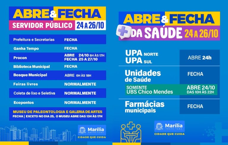 O Procon-Marília será a única exceção, conforme o Decreto nº 14.813/2025: o órgão funcionará normalmente na sexta-feira (24), das 8h às 17h, e estará fechado na segunda-feira, dia 27, quando cumprirá o ponto facultativo.