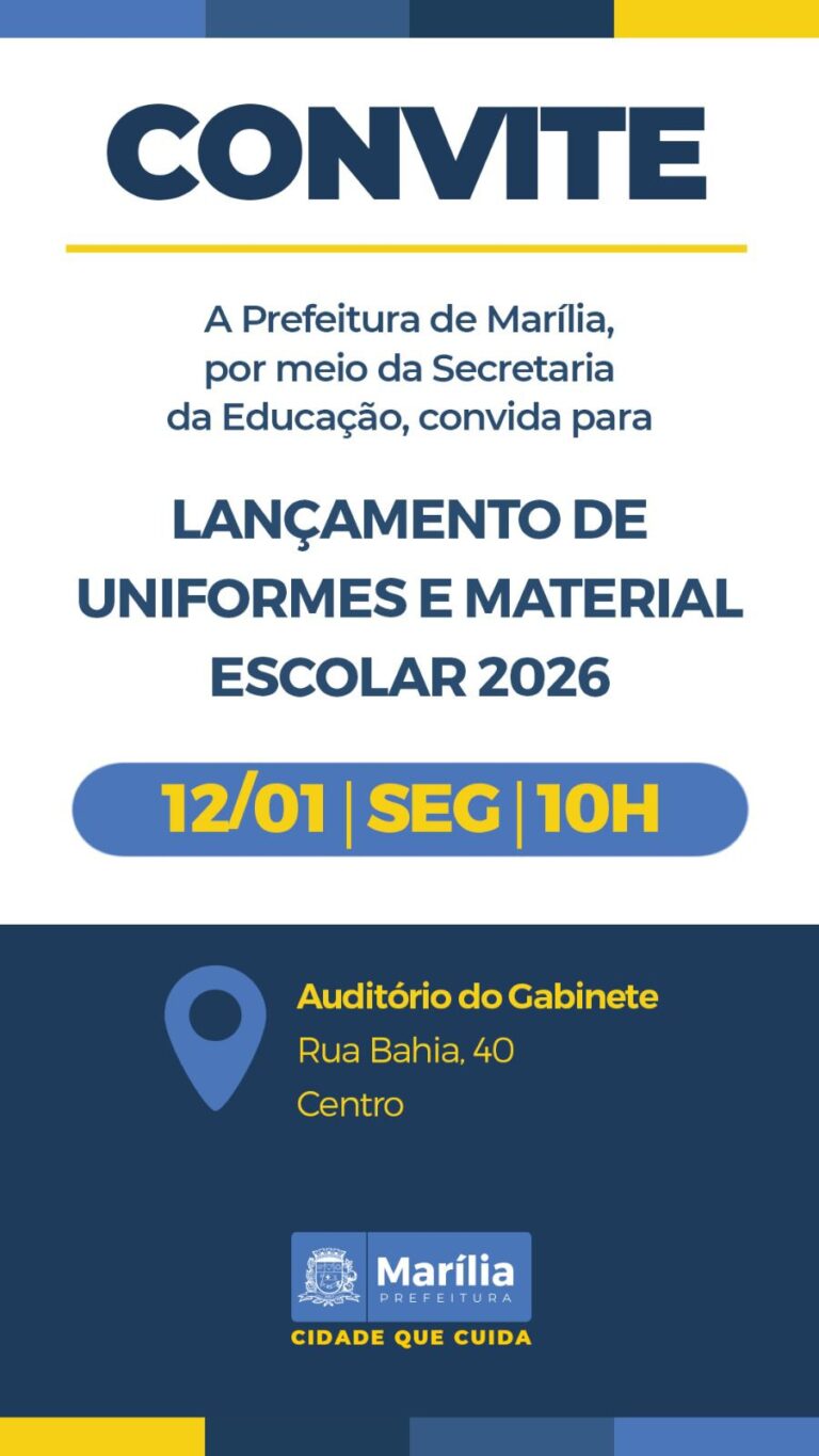 A Prefeitura de Marília lança nesta segunda-feira (12), às 10h, no auditório do gabinete do prefeito, no Paço Municipal, a entrega de uniformes e de material escolar para a rede de ensino. A ação é coordenada pela Secretaria da Educação e vai atender cerca de 19 mil alunos, segundo a administração.