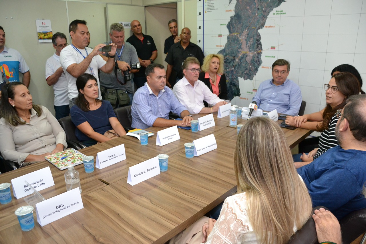 Reunião de servidores da Saúde e de hospitais de Marília no gabinete do prefeito na segunda-feira (16) – (Foto: Leonardo Moreno/Marília Notícia)