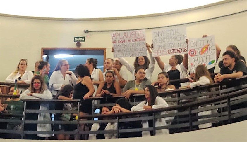 Ainda no início da sessão ordinária da segunda-feira (4), dezenas de profissionais da Enfermagem lotaram as galerias do plenário em manifestação pacífica pelo pagamento do piso nacional. Vestidos de jaleco e com nariz de palhaço, fizeram um ‘apitaço’.