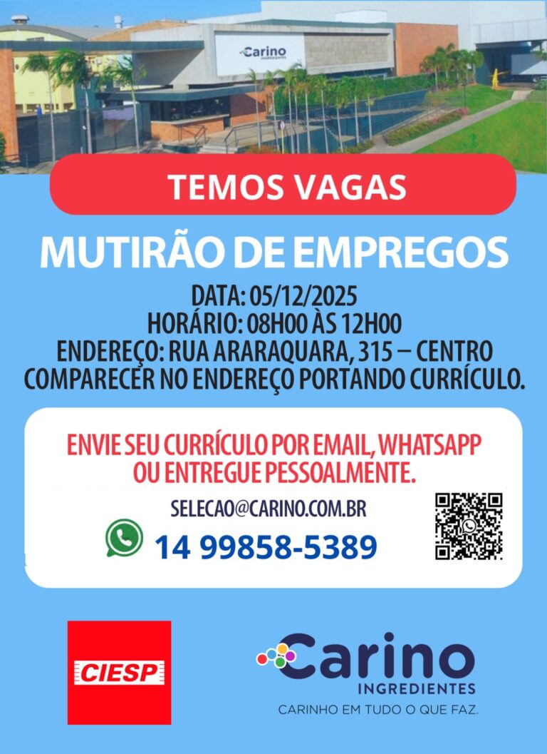 O mutirão da Carino acontecerá no Ciesp, localizado na rua Araraquara, 315 – Centro, das 8h às 12h, com atendimento por ordem de chegada. Os interessados devem comparecer com currículo em mãos, ou, se preferirem, enviar previamente pelo WhatsApp (14) 9 9858-5389 ou e-mail [email protected]. As vagas disponíveis são para o cargo de operário I, distribuídas nos seguintes turnos: