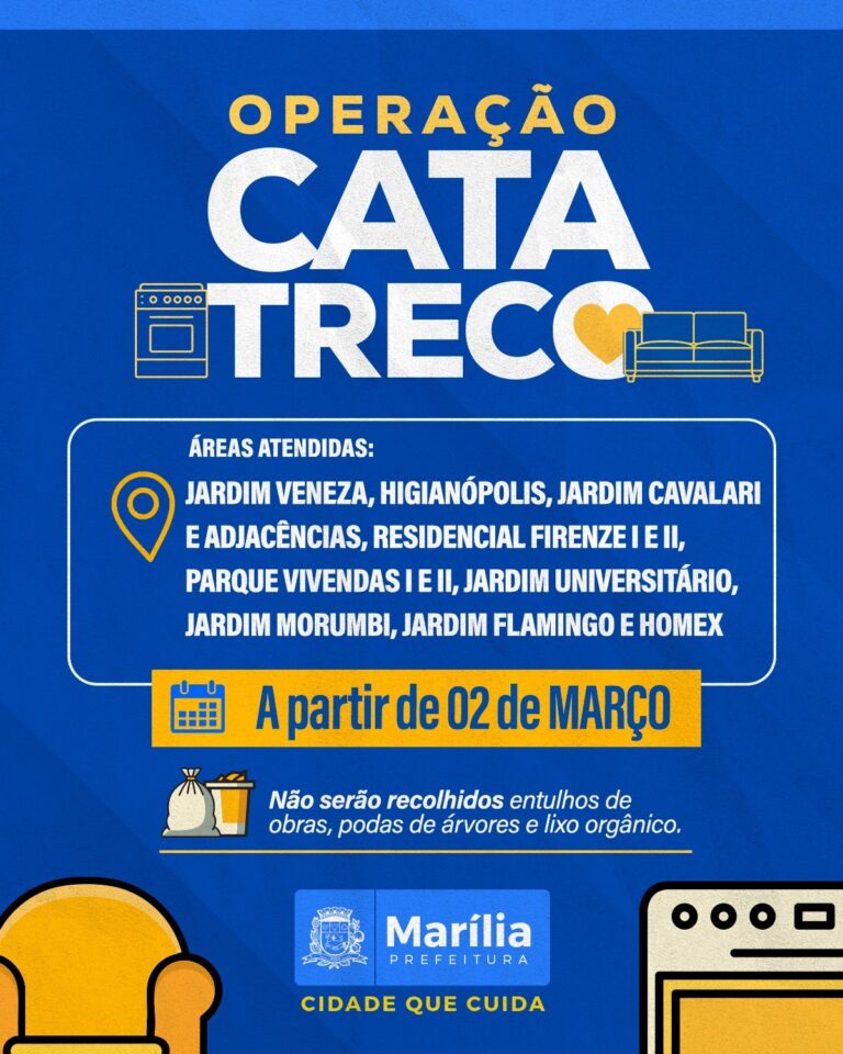 A Prefeitura de Marília inicia na segunda-feira (2) uma nova etapa da Operação Cata-Treco, com atendimento em bairros das zonas sul e oeste. A ação é coordenada pela Secretaria Municipal do Meio Ambiente e Serviços Públicos e integra os serviços de zeladoria urbana.