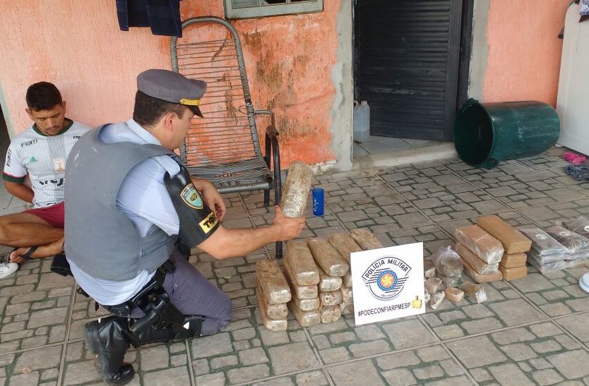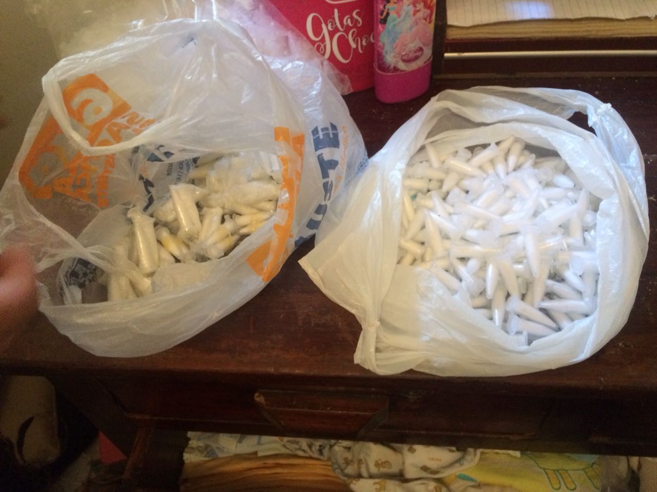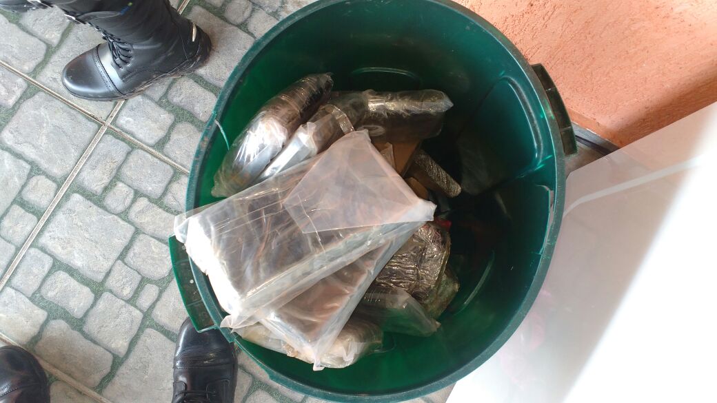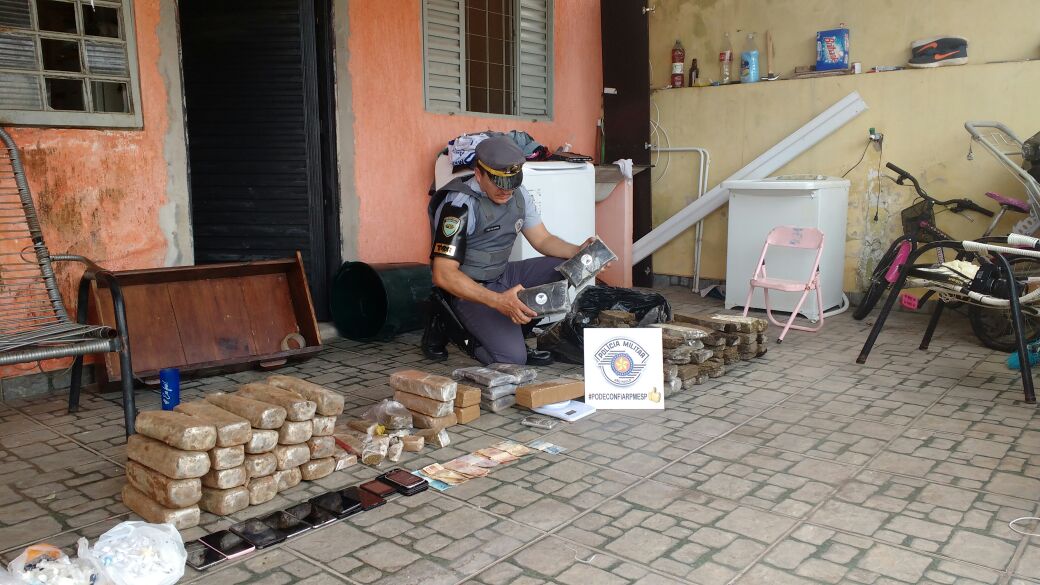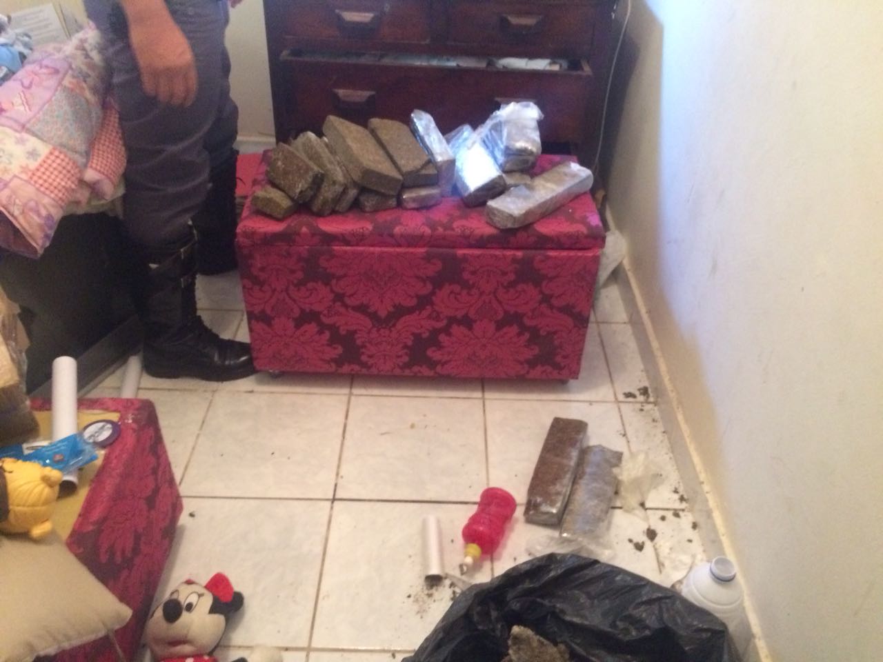 Na residência, onde estavam uma criança de colo e uma adolescente, foram apreendidos 56 tijolos de maconha e vários fragmentos menores que pesaram 62,6 quilos, mais nove tabletes de haxixe totalizando 8,9 quilos e 302 pinos com cocaína.