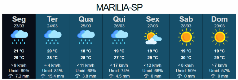 Marília iniciou a segunda-feira (23) com céu nublado e previsão de chuva, segundo o Instituto de Pesquisas Meteorológicas (IPMet). Os dados, baseados em radares das últimas horas, indicam uma semana de instabilidade, com precipitações previstas até quinta-feira (26) e variação nas temperaturas.