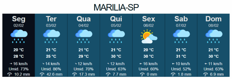 A previsão meteorológica para os próximos dias indica grande volume de chuvas em Marília, reacendendo o alerta para moradores da zona rural e usuários das rodovias que cortam o município. Os dados são do Instituto de Pesquisas Meteorológicas (IPMet), de Bauru, e foram atualizados nas últimas horas, podendo sofrer alterações ao longo da semana.