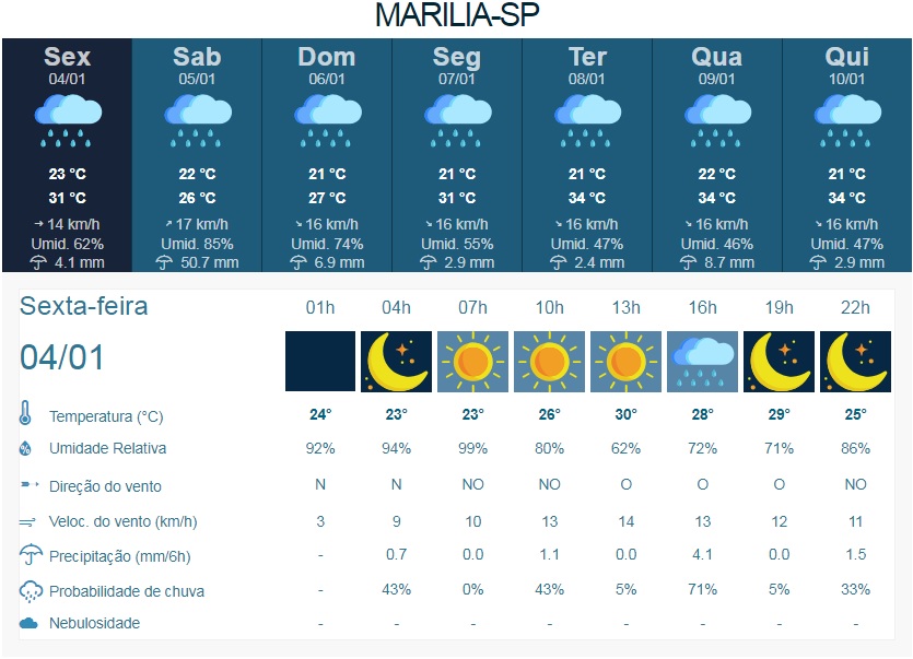 Bastante chuva é a previsão do tempo para Marília feita pelo Instituto de Pesquisas Meteorológicas (IPMet) da Universidade Estadual Paulista (Unesp) para os próximos dias. Nesta sexta-feira (4) também deve cair mais água do céu, cerca de 4,1 milímetros.