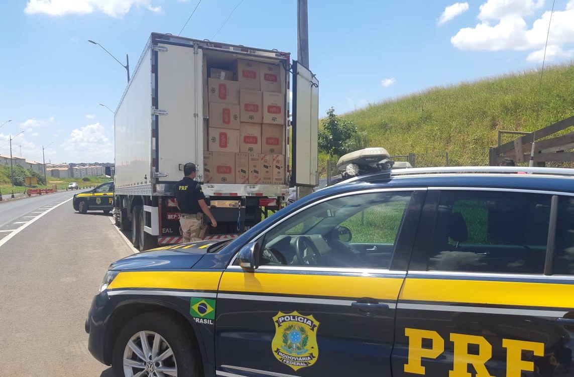 Ao abrir a tampa do baú foi constatado que, apesar de apresentar nota fiscal de carne, o caminhão estava carregado com caixas de cigarro de origem estrangeira.