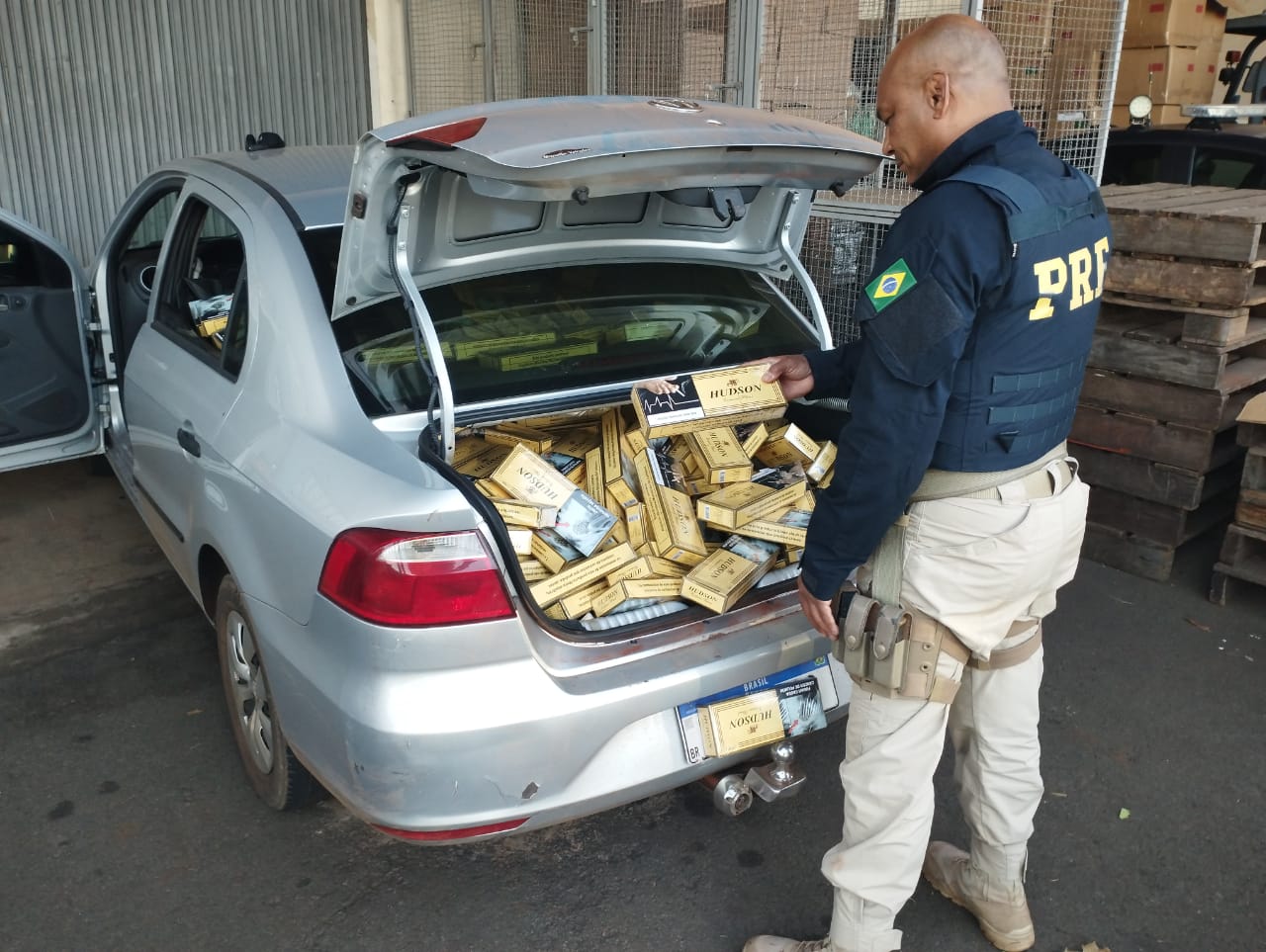 Dentro do Voyage, os agentes encontraram diversas caixas de cigarros contrabandeados, ocupando os bancos da frente, traseiro e o porta-malas. Os detidos admitiram que a mercadoria foi carregada em Foz do Iguaçu, na fronteira do Brasil com o Paraguai.