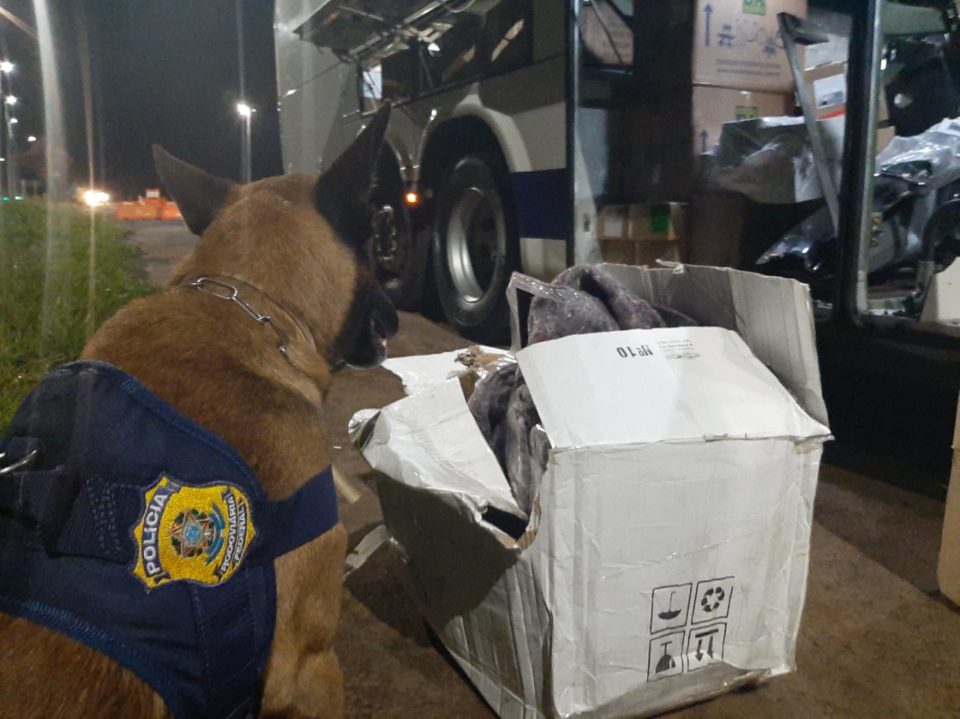 Durante fiscalização de combate ao crime, policias rodoviários federais localizaram, com ajuda de cão farejador, 70 tabletes de maconha no bagageiro de um ônibus, que fazia a rota de Santo Antônio da Platina/PR até a capital de São Paulo.