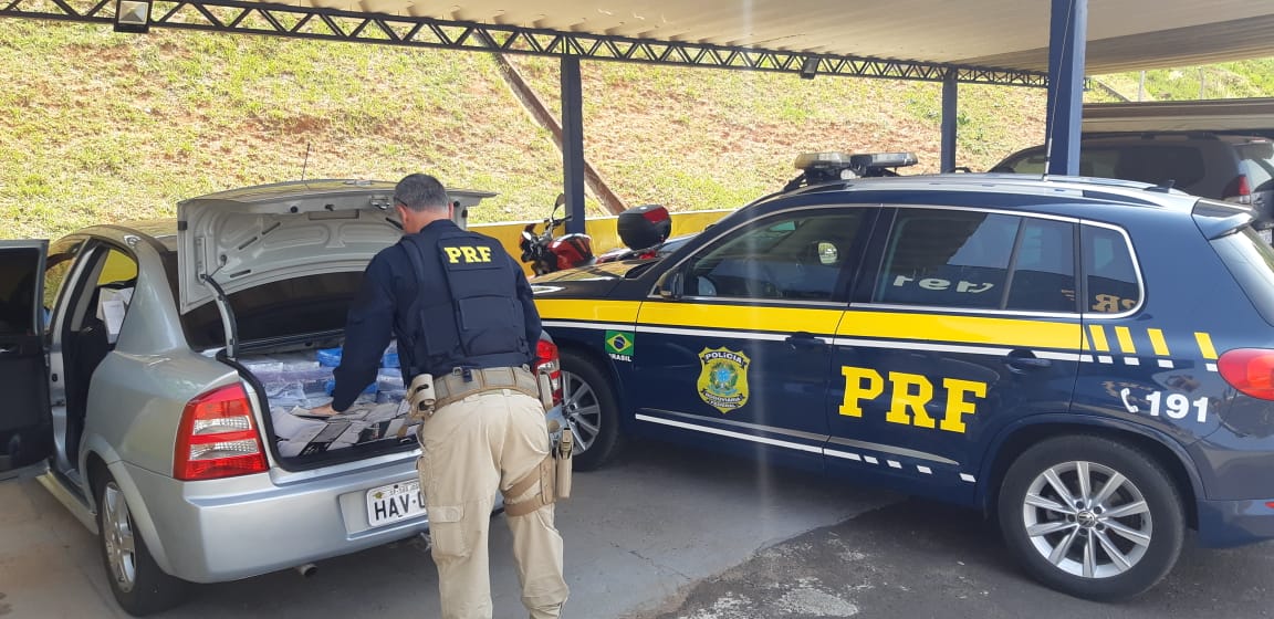 Assim que foram abordados, os policiais perceberam um volume de mercadorias no banco de trás do veículo, coberto com um pano preto, a fim de tentar ludibriar uma fiscalização.