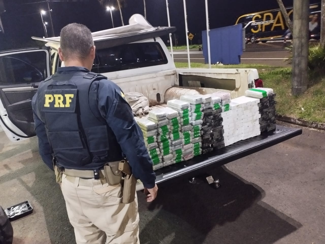 A ocorrência começou quando a equipe da PRF fazia ronda próximo à divisa com o Paraná, em Camabará/PR, à 0h50. Uma caminhonete GM S10 ocupada por dois homens foi abordada.