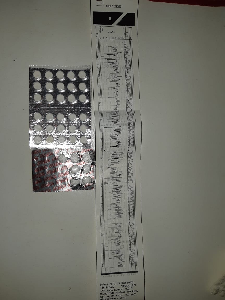Ele apresentou uma cartela de 15 comprimidos, faltando sete deles. Posteriormente, em vistoria à cabine do caminhão, foram localizadas mais duas cartelas com 15 comprimidos cada, intactas.