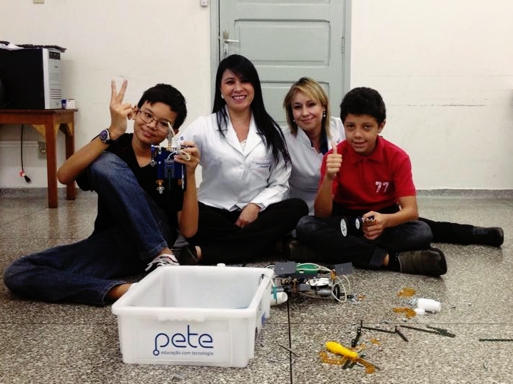 Dinâmica em grupo com utilização dos robôs. Ao centro, as pesquisadoras Andréa Misquiatti e Maria Claudia Brito (Foto: Divulgação)