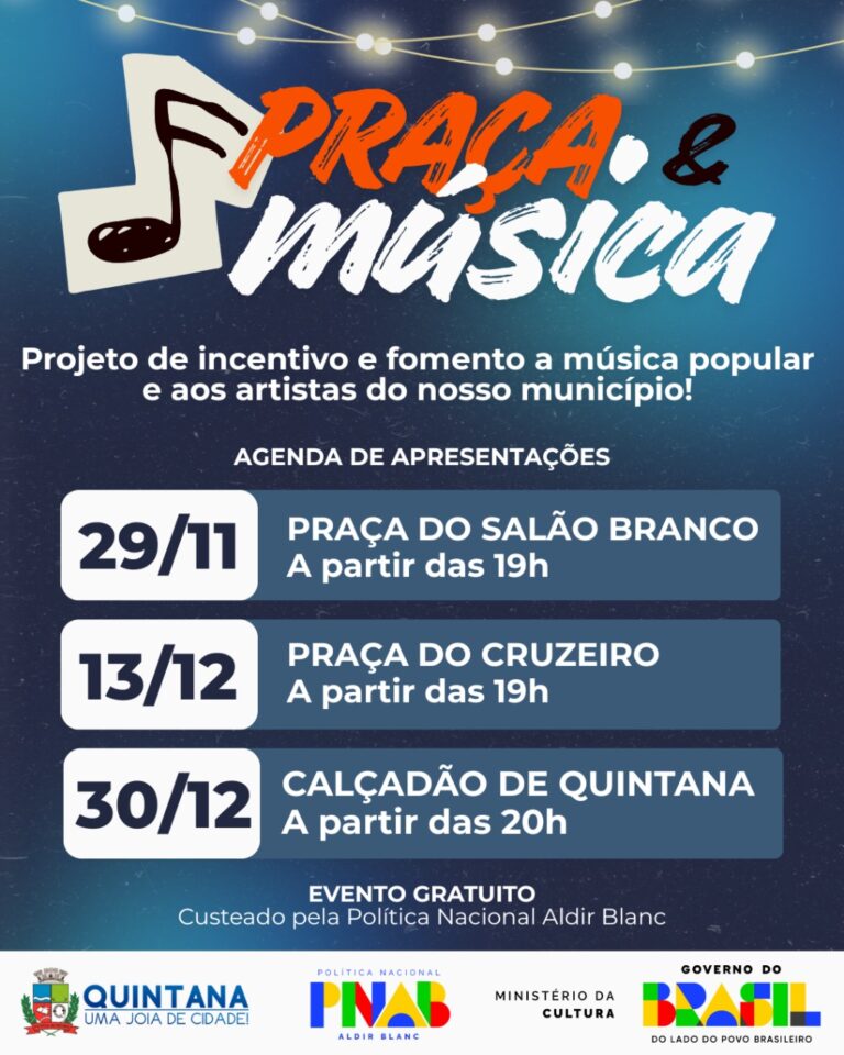 O Governo de Quintana promove, a partir deste mês, o Projeto Praça & Música, iniciativa voltada ao incentivo da música popular e à valorização dos artistas locais. A ação propõe encontros culturais gratuitos em diferentes praças da cidade, com apoio da Política Nacional Aldir Blanc (PNAB) e do Ministério da Cultura.