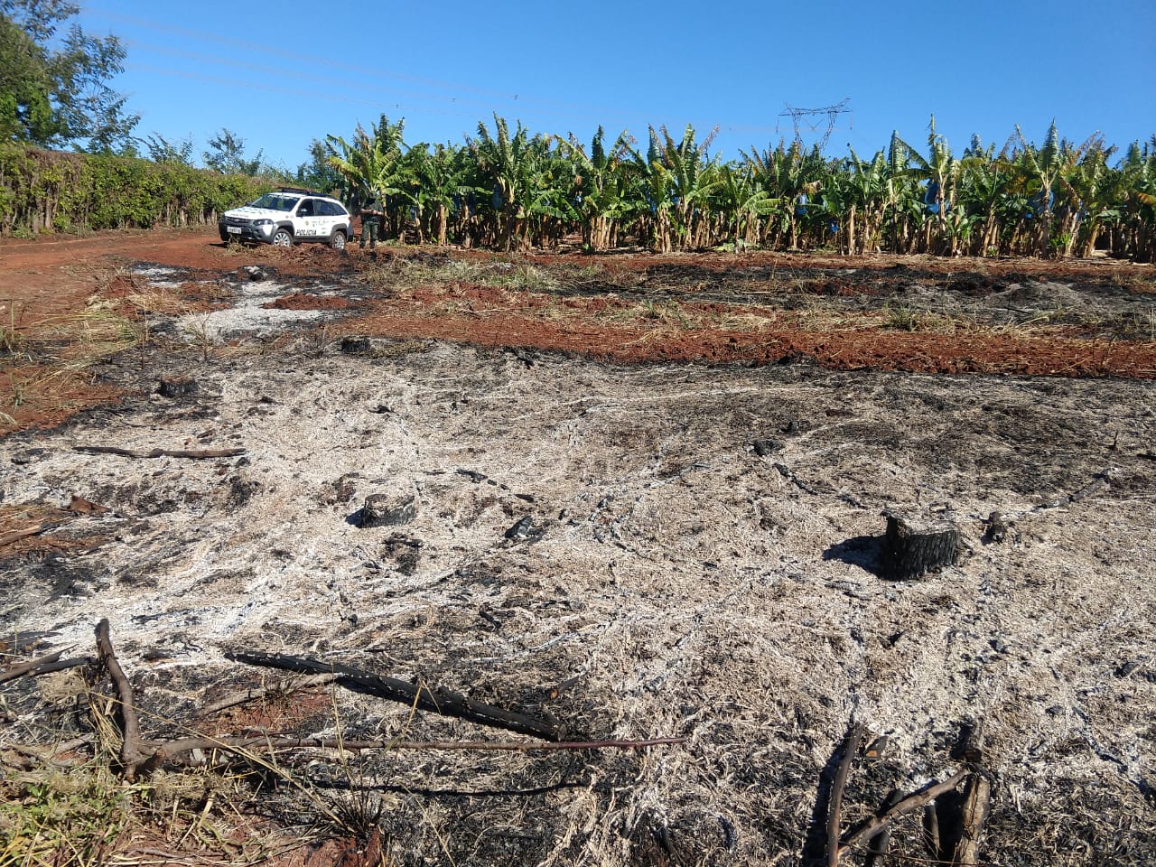 A Polícia Ambiental recebeu uma denúncia sobre foco de queimada e realizou uma vistoria ambiental em uma chácara, onde foi constatada uma queimada em área comum, correspondente a 1,23 hectares, sem autorização do órgão ambiental competente.