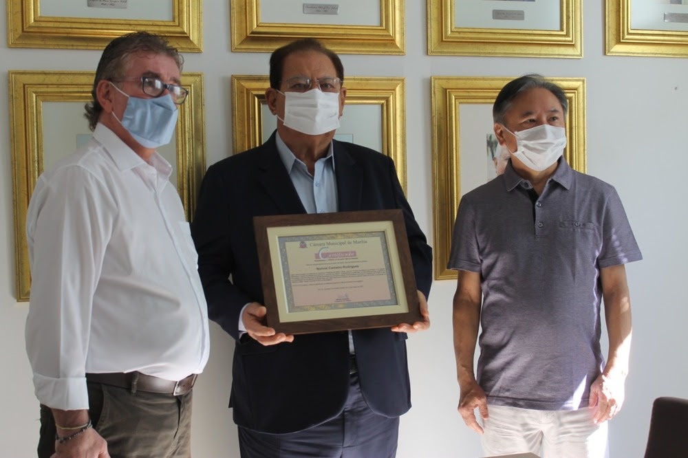 Acompanhado pelo presidente da Junta Comercial do Estado de São Paulo (Jucesp) e ex-deputado federal Walter Ihoshi (PSD), o presidente do Poder Legislativo de Marília, vereador Marcos Rezende (PSD), entregou votos de congratulações para o provedor da Santa Casa de Misericórdia de Marília, Norival Carneiro Rodrigues.