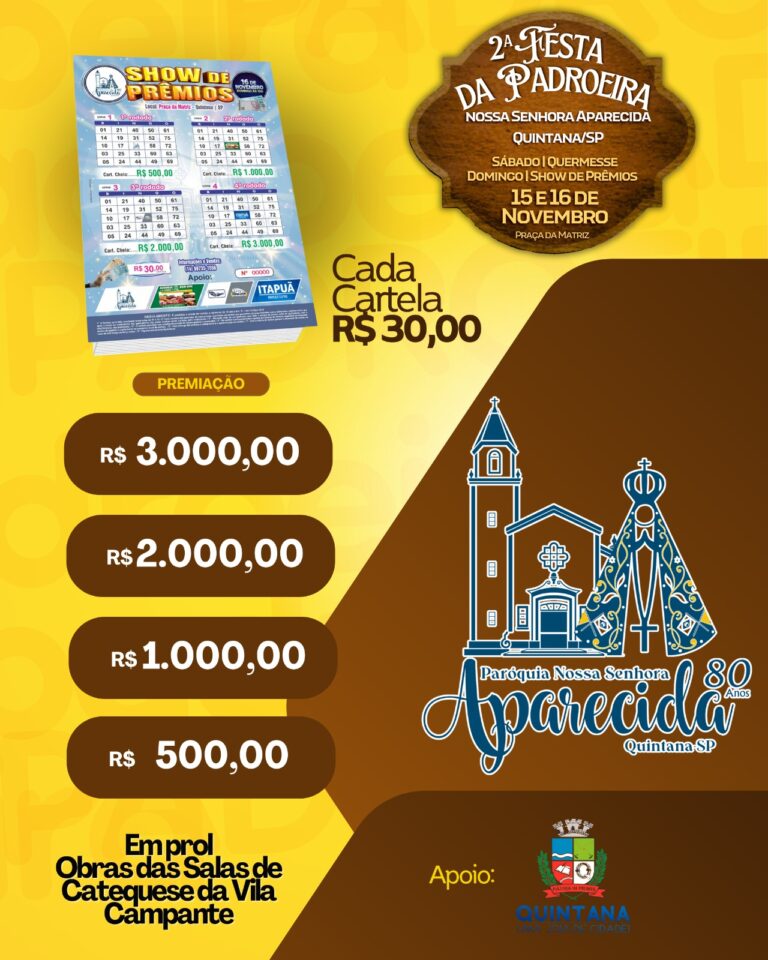 Sob a liderança do padre André Luiz Martins dos Santos, natural de Quintana, a festa contará com missas, quermesse e o tradicional Show de Prêmios, que sorteará valores de até R$ 3 mil, com cartelas vendidas a R$ 30. Segundo a Paróquia, a iniciativa busca fortalecer a fé e contribuir para a formação religiosa das novas gerações.