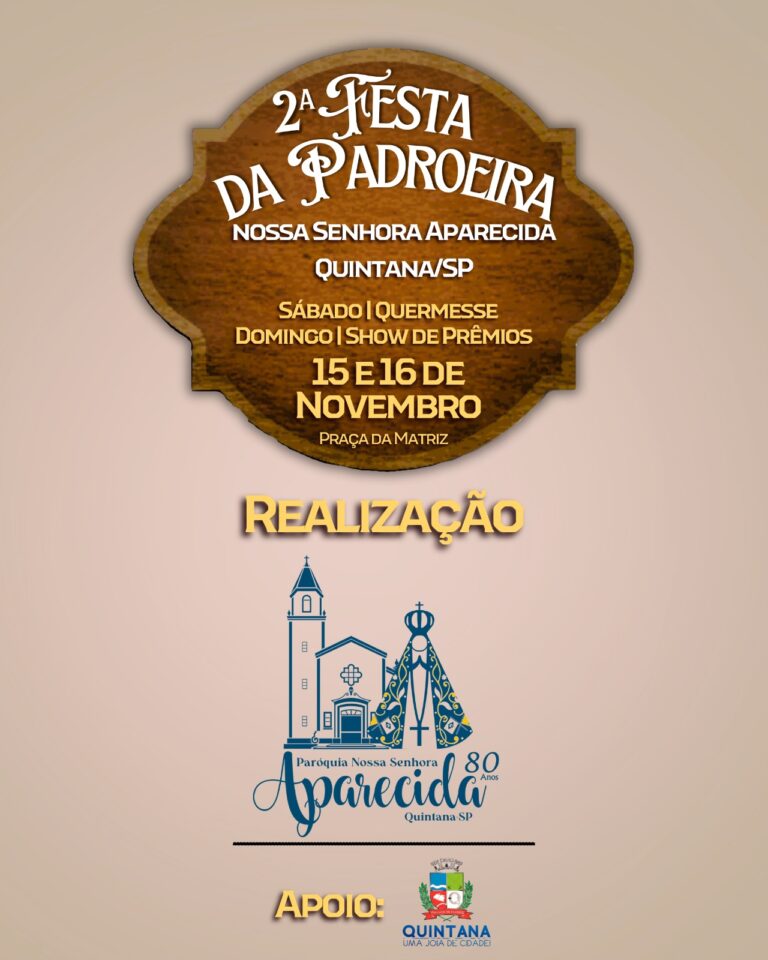A cidade de Quintana realiza nos dias 15 e 16 de novembro, na Praça da Matriz, a 2ª Festa da Padroeira Nossa Senhora Aparecida, evento que une tradição religiosa, cultura e integração comunitária. A celebração marca os 80 anos da Paróquia Nossa Senhora Aparecida e tem como principal objetivo arrecadar recursos para as obras das Salas de Catequese da Vila Campante.