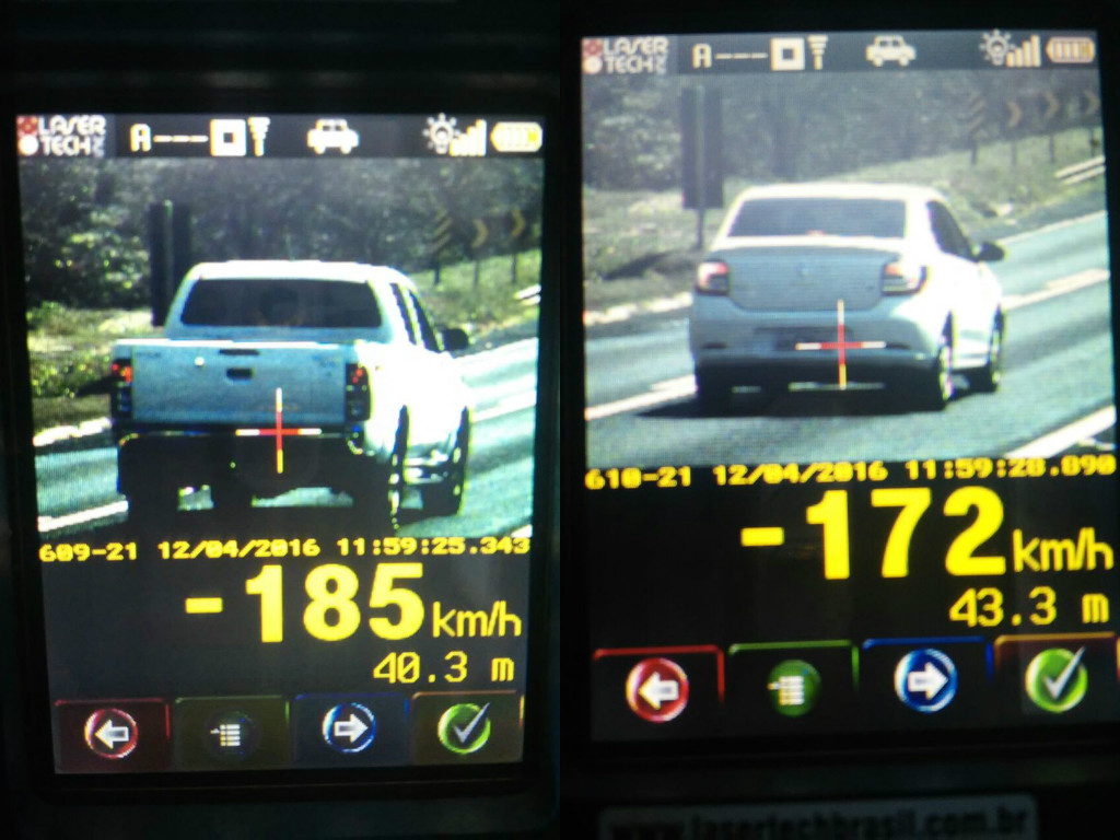 Um dos flagrantes mostra uma caminhonete a 185 km/h em pista simples. A conduta extremamente nociva de circular com veículo acima da velocidade permitida é uma das principais causas de mortes no trânsito.