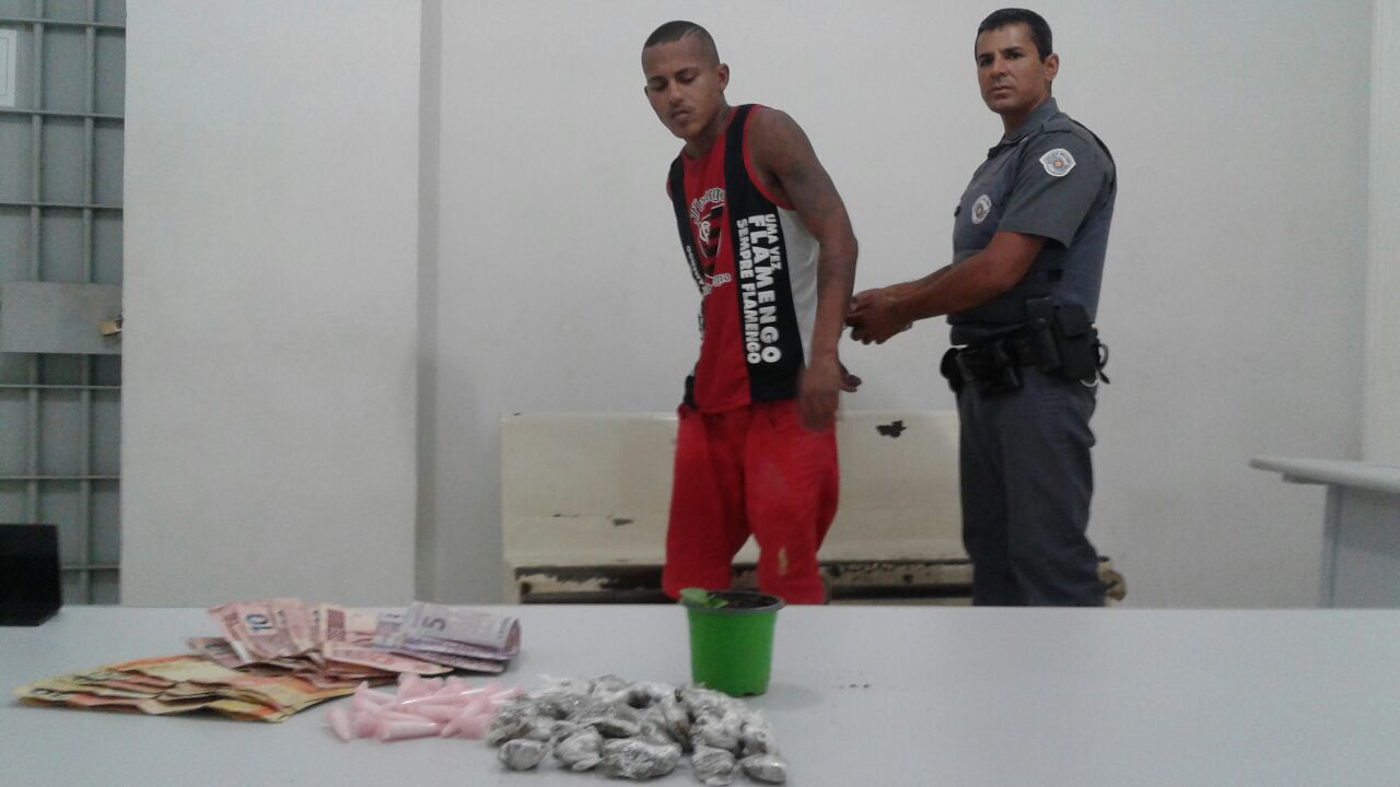 Ao avistar a viatura ele jogou fora um pacote com 21 pinos com cocaína, 28 porções de maconha e R$ 225 em dinheiro.