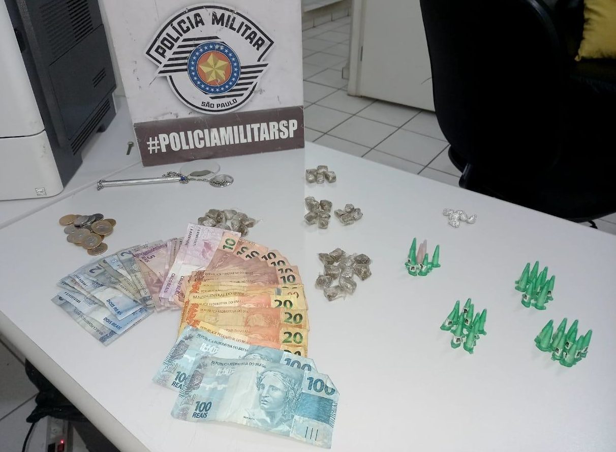 Com ele havia R$ 509 e um saco plástico contendo 38 papelotes com cocaína, 35 trouxinhas de maconha e seis pedras de crack.