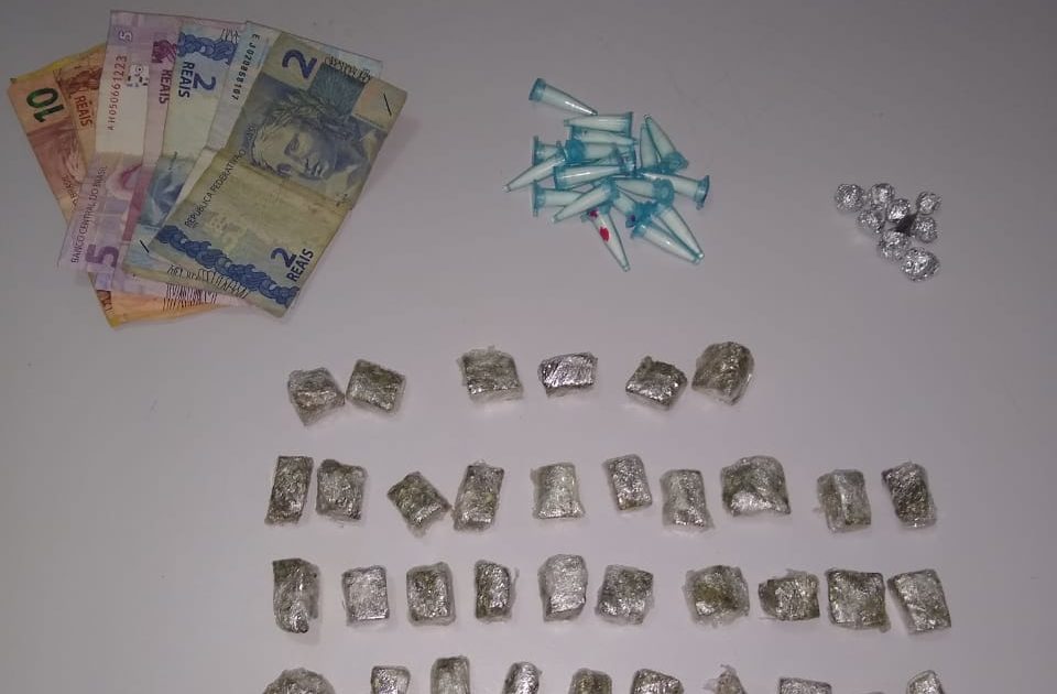 Com ele foram localizados dois pinos de cocaínas, duas trouxinhas de maconha e R$113. No local em que ele estava foram encontrados 17 pinos de cocaína, oito porções de crack e 54 trouxinhas de maconha enterrados.