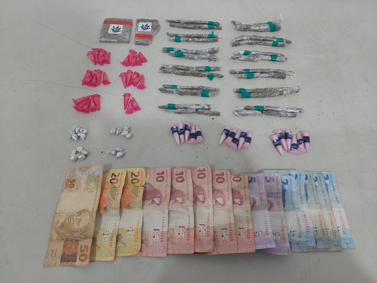 Na sacola havia 46 porções de crack, 16 porções de cocaína, 26 porções de maconha e R$ 160.