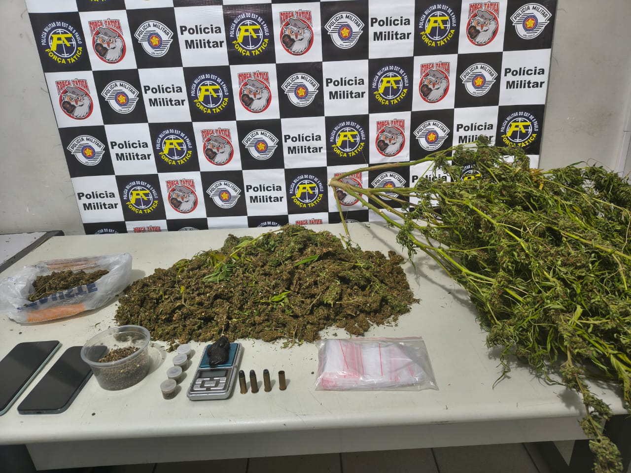 Durante as buscas, foram apreendidos 40 gramas da droga já fracionada, 1,91 quilo de maconha em forma de planta e outras 69 gramas em sementes, além de uma balança de precisão digital e materiais para embalagem.