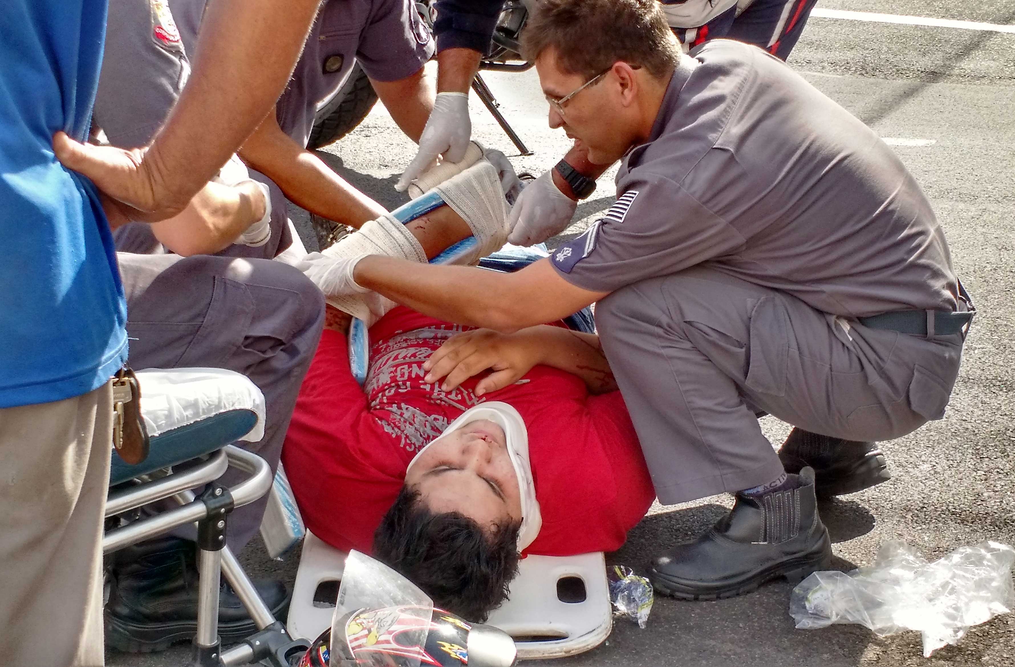 Viaturas do Corpo de Bombeiros e Samu estiveram no local e socorreram a vítima, que foi encaminhada por uma unidade de resgate até o Hospital das Clínicas. Além da fratura, o jovem tinha escoriações no rosto e em todo o corpo. Confira as fotos do acidente: