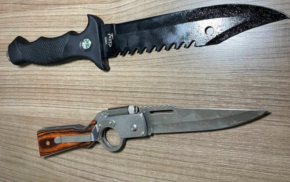 A polícia apreendeu duas facas e a arma falsa, além do celular do autor. Imagens do circuito de monitoramento do prédio registraram toda a ação.