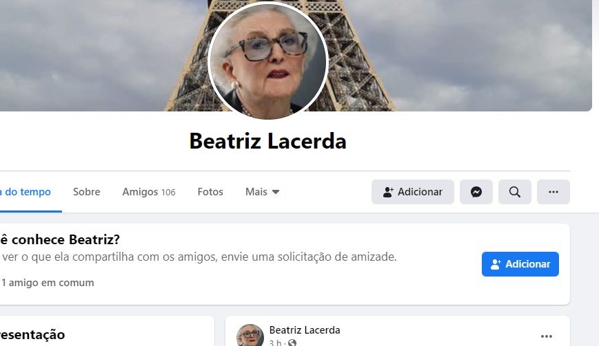 Neste caso, um bom exemplo é o fake chamado ‘Beatriz Lacerda’, que apresenta foto de uma idosa, de cabelos brancos e óculos com lentes azuladas, com a Torre Eiffeil ao fundo.