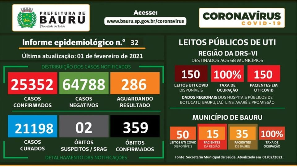 Bauru soma 25.352 casos confirmados da doença, dos quais são 21.298 curados e 359 mortes. Outros 286 considerados suspeitos aguardam resultado de exames. Há duas mortes em investigação.