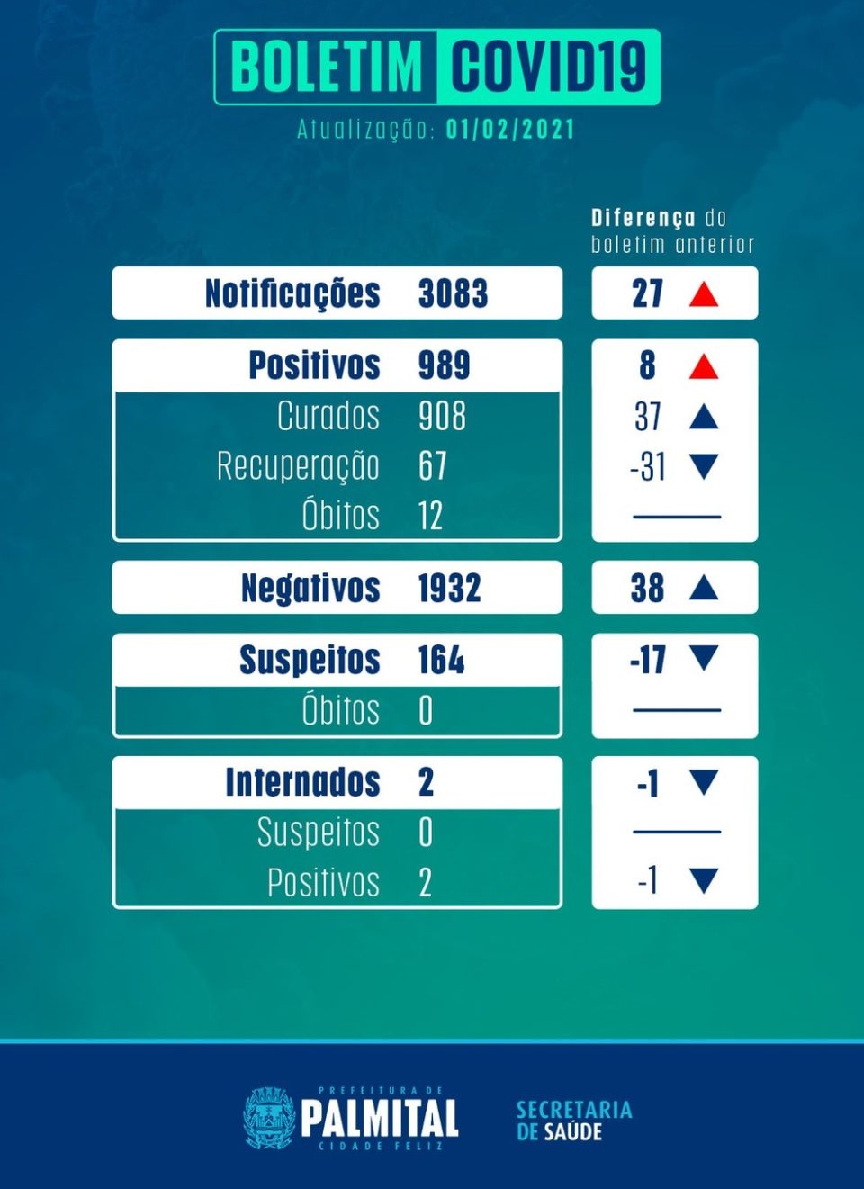 Palmital soma 989 casos confirmados da doença, dos quais são 908 curados e 12 óbitos. Outros 164 considerados suspeitos seguem em investigação.