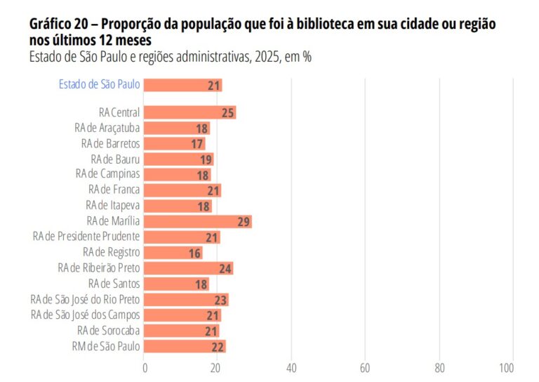 A região também demonstrou valorização da leitura e dos espaços a ela dedicados. Enquanto a média estadual de frequência a bibliotecas permanece em 21% desde 2022, a RA de Marília registrou o maior índice de visitação, com 29% da população frequentando esses equipamentos culturais.