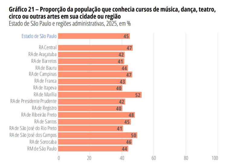 O nível de conhecimento sobre oportunidades de formação artística também é elevado entre os moradores da região. Segundo o levantamento, 52% dos habitantes da RA de Marília afirmaram conhecer a oferta de cursos de artes — como música, dança, teatro e circo — em sua cidade ou região, um dos índices mais altos do Estado.
