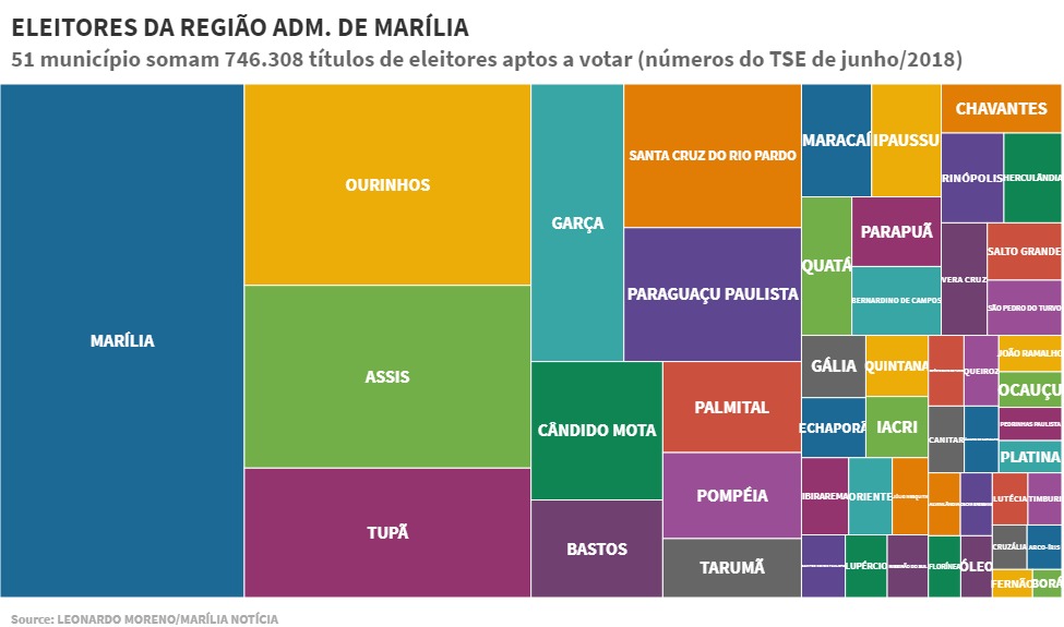 Para se ter ideia, os 746 mil eleitores da regional de Marília são apenas 2,26% do eleitorado do Estado de São Paulo, a unidade federativa com mais títulos de eleitor ativos, com 33 milhões votantes.