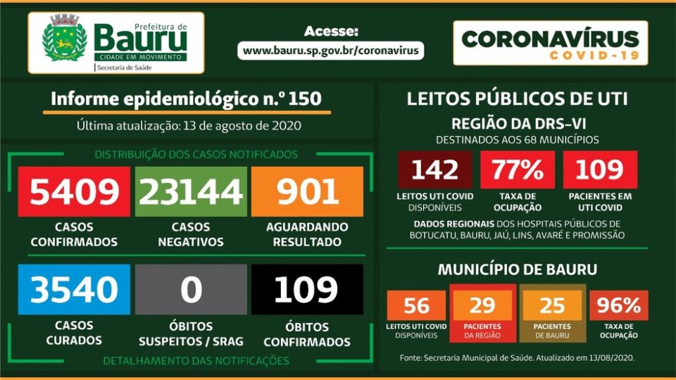 Bauru contabiliza 5.409 diagnósticos positivos, sendo 109 óbitos e 3.540 considerados curados. Outros 901 casos suspeitos aguardam resultado de exames.