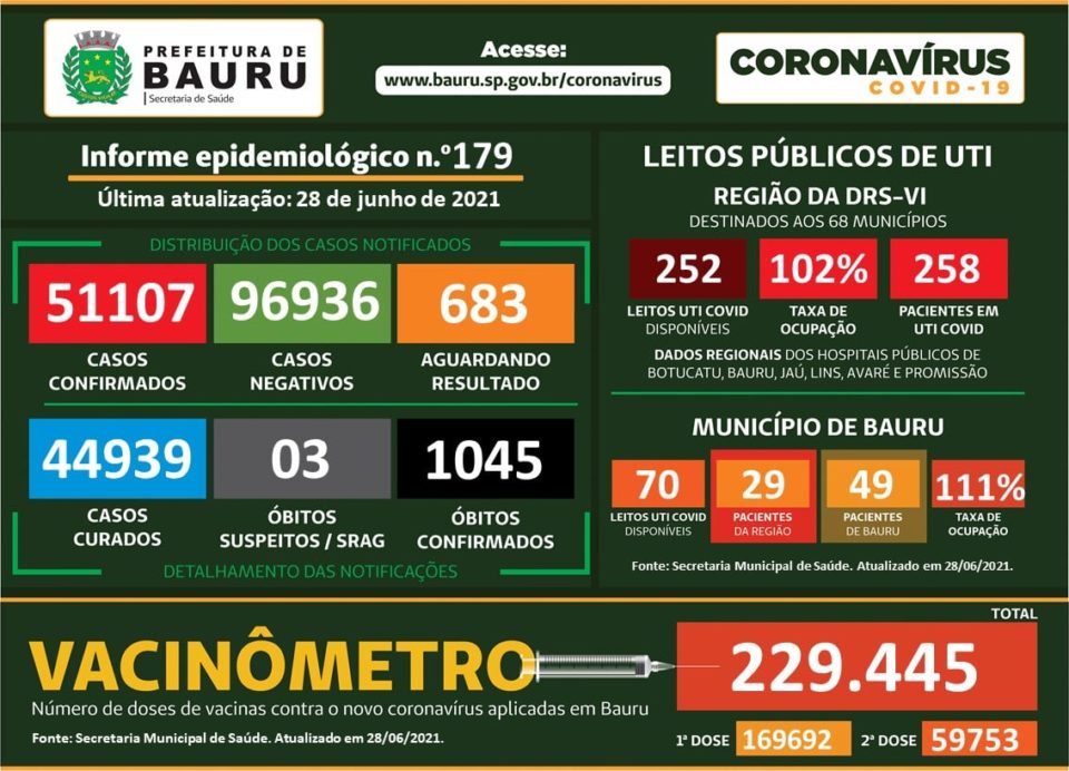 Bauru contabiliza 51.107 casos confirmados da doença, dos quais 44.939 estão curados e 1.045 óbitos. Há três mortes em investigação.