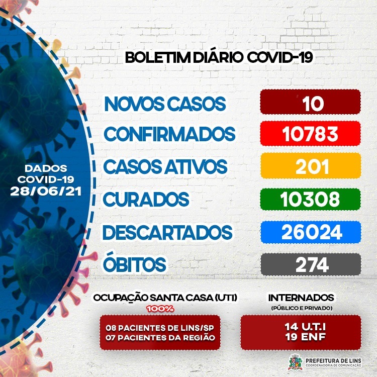 A Prefeitura de Lins (distante 73 quilômetros de Marília) informou mais quatro mortes por Covid-19 ontem. As vítimas são três homens, de 34, 43 e 44 anos, e uma mulher, de 91.
