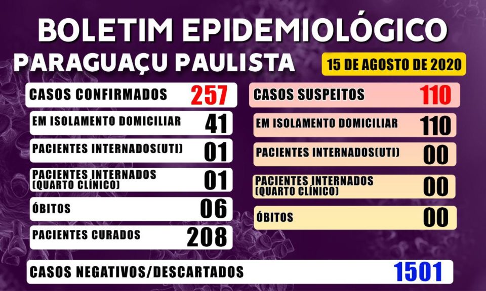 O município tem ao todo 257 testes positivos da doença, desde o início da pandemia, sendo seis mortes e 208 considerados curados. Outros 110 casos suspeitos estão em investigação.
