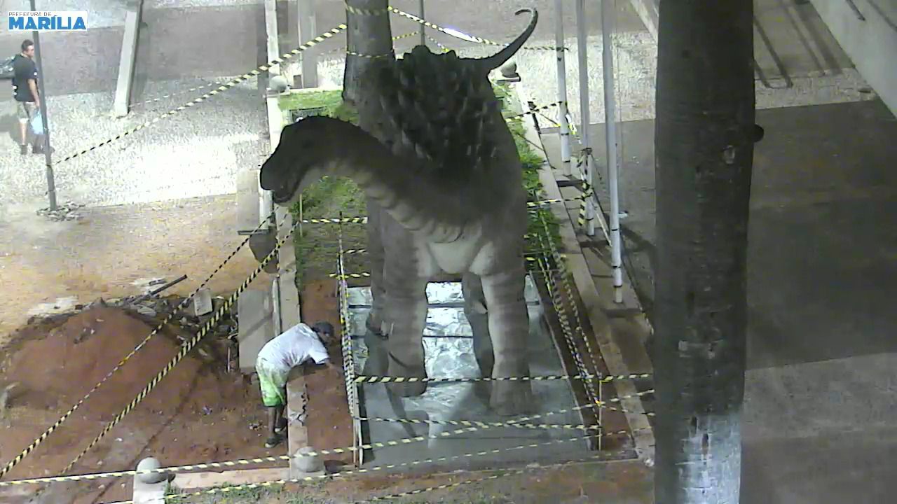 A Prefeitura de Marília mal acabou de instalar a réplica de Dino Titã em frente ao Museu de Paleontologia e já registrou atos de vandalismo junto à base da escultura. As câmeras de monitoramento do Programa Ronda Azul flagraram a ação.