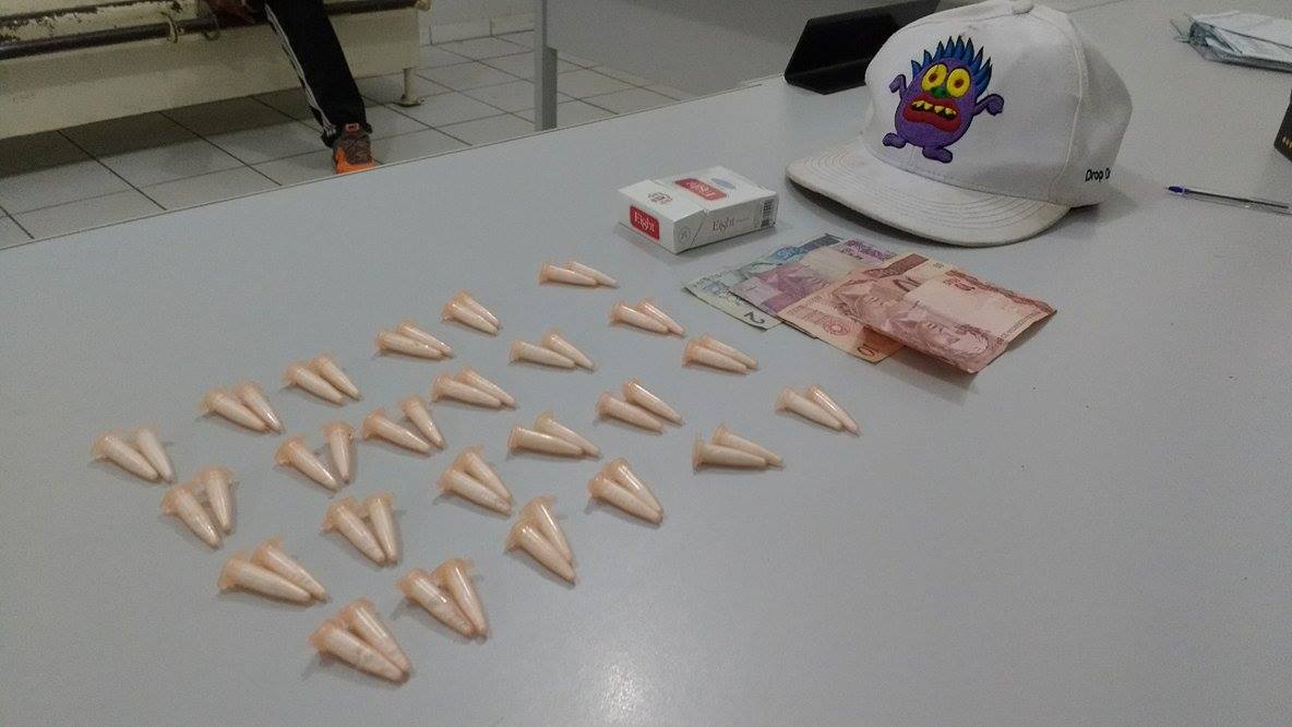 Ele foi imediatamente abordado pelos policiais. Em buscas pelo terreno e telhado, foram encontrados 46 pinos com cocaína e pequena quantidade em dinheiro.