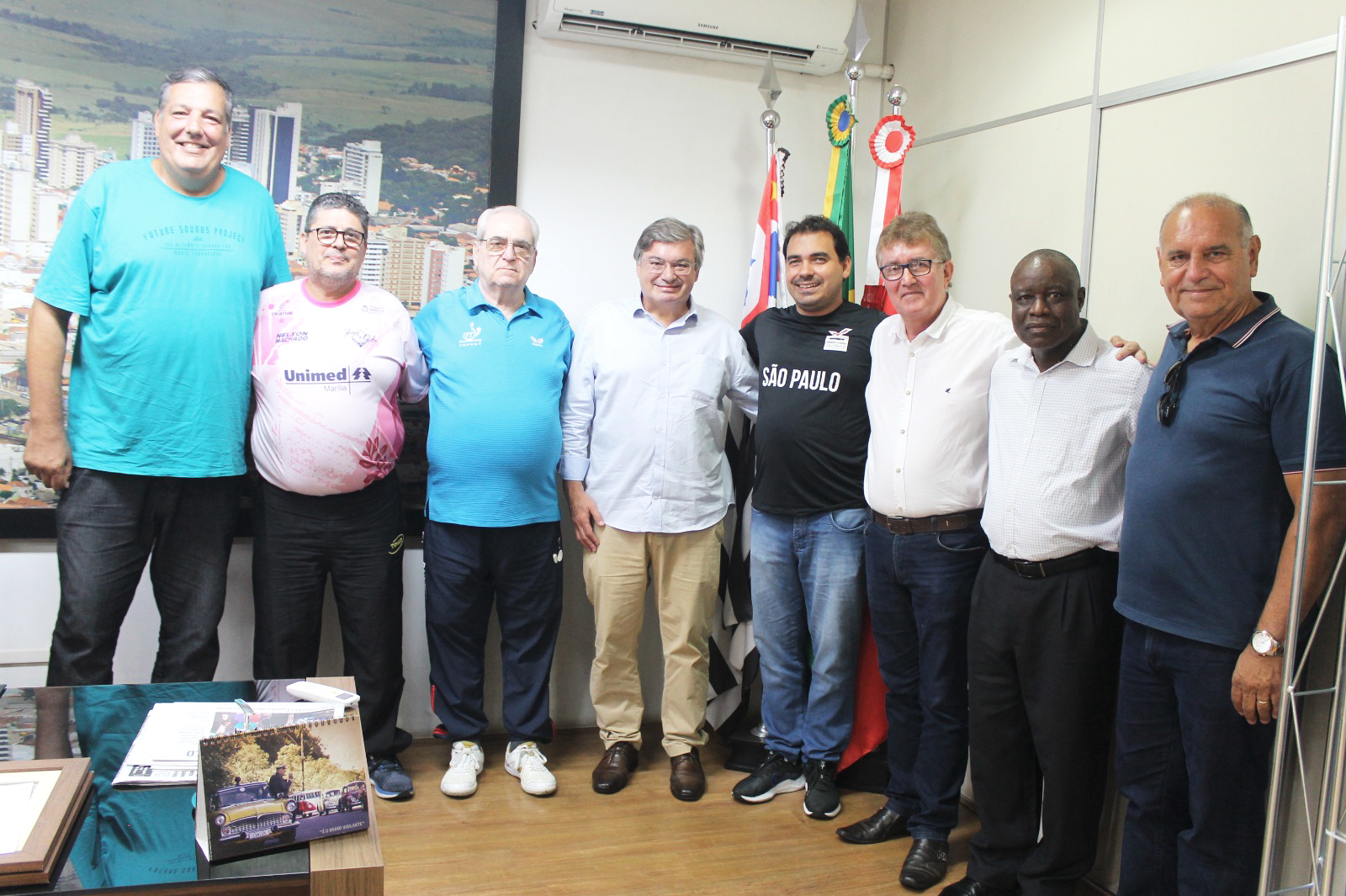 Representantes de duas delegações internacionais de tênis de mesa, que estão em Marília para a 29ª Clínica Internacional Nelson Machado & Abílio Cruz, foram recebidos nesta semana pelo prefeito Daniel Alonso (sem partido) e pelo secretário municipal de Esportes, Lazer e Juventude, Gastão Pinheiro. O encontro ocorreu em audiência no gabinete do chefe do Poder Executivo, no Paço Municipal.