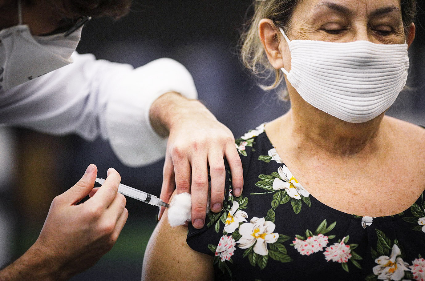 Mulher é vacina contra a Covid-19 no Rio de Janeiro. 18/03/2021. REUTERS/Ricardo Moraes.