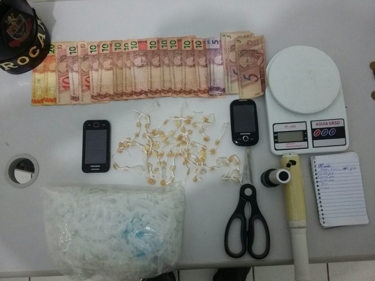 Ele estava em um colchão embalando pedras de crack. Foram encontradas 22 porções, além de tesoura, embalagens, balança de precisão, anotações do tráfico e também R$ 195 em dinheiro. Com ajuda dos cães farejadores o restante da droga foi achada no colchão.