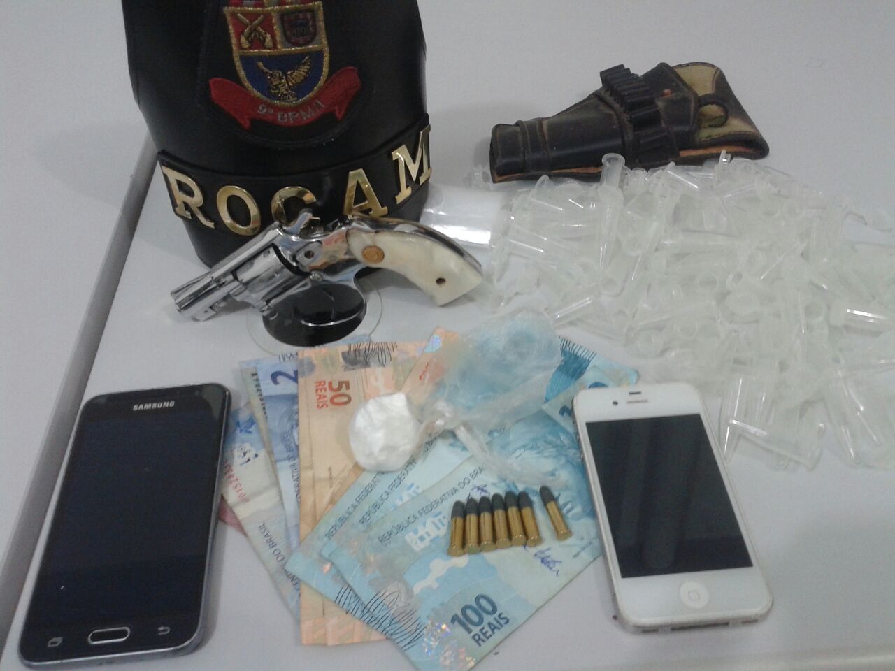 Oliveira foi algemado e levado até sua residência, onde os policiais aprenderam cerca de 400 pinos para armazenamento de entorpecentes, uma arma, mais de R$ 400 em dinheiro e dois celulares de procedência não informada.