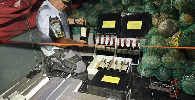 Segundo o condutor, que não teve a identidade divulgada, os produtos eram transportados sem documentação fiscal. Ao todo, foram apreendidas cerca de 3.500 garrafas de vinho de diversas marcas, todas de origem estrangeira.