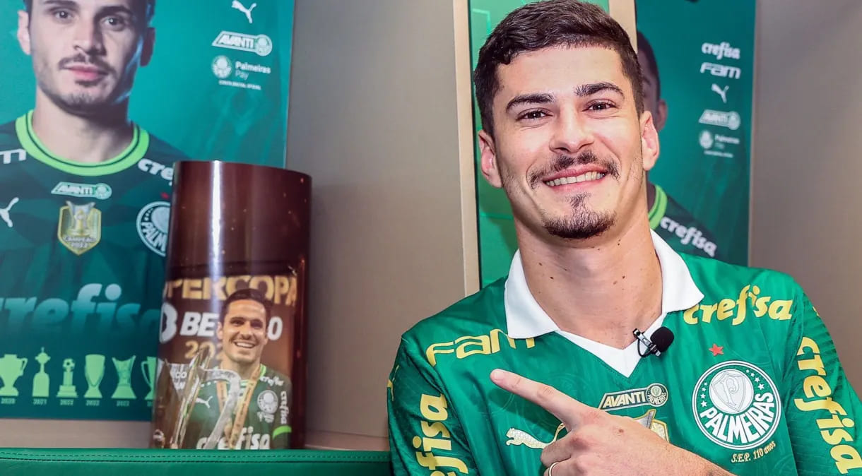 Relação com Raphael Veiga: “Gosto muito do jogo dele, é minha referência. Pedi a camisa dele, perguntei se poderia conversar com ele. A gente nunca tinha conversado, me tratou super bem. Me deu boas palavras para eu continuar trabalhando. Depois alguns jogos veio a notícia do Palmeiras e estou muito feliz em poder atuar aqui e com ele”.
