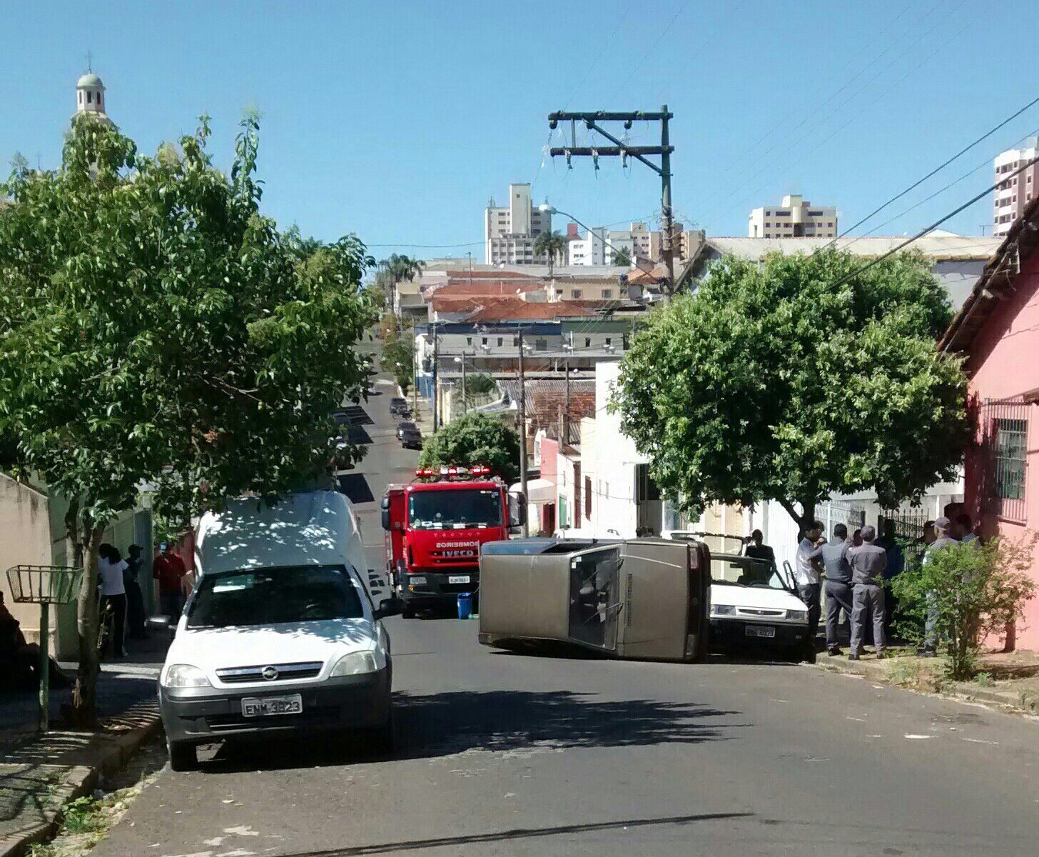 Um carro também tombou na rua 9 de Julho, pouco depois da Igreja Santo Antônio. Segundo testemunhas, o condutor do carro estaria mexendo no celular e perdeu o controle da direção. Felizmente o motorista não se machucou.