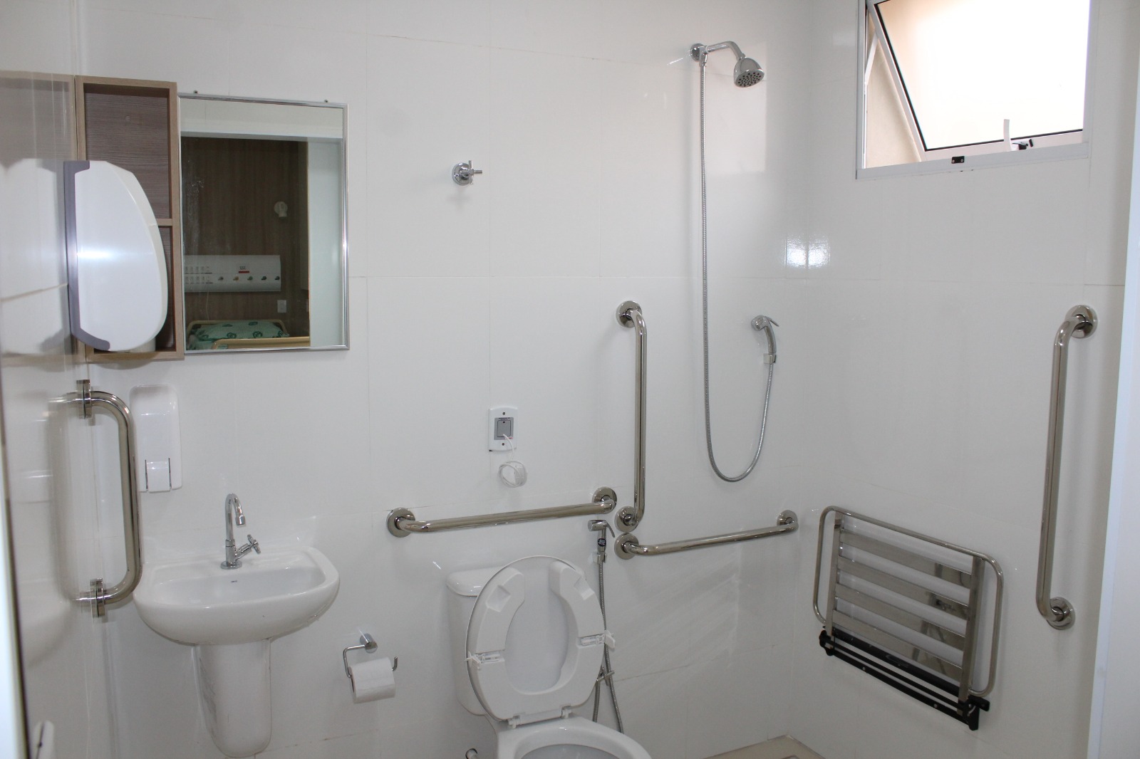 Os banheiros foram adaptados com barras de apoio, acessibilidade e sistema de aquecimento solar. O corredor da ala D também passou por melhorias, com instalação de luminárias de LED e controle de acesso por porta de vidro com senha.